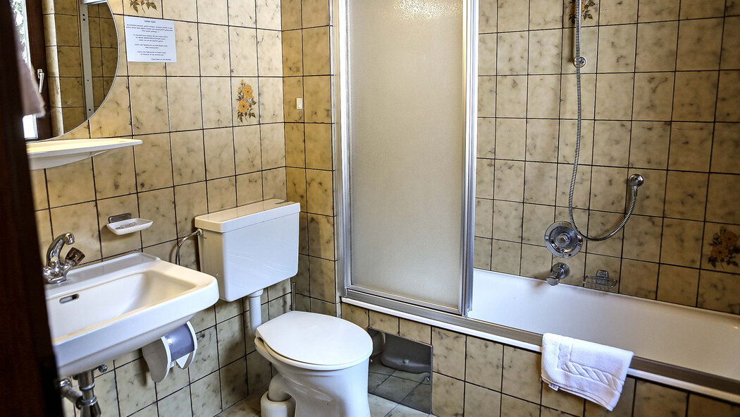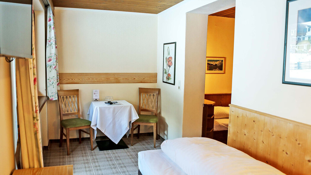 Dreibettzimmer (ca. 24 m2) mit 3 getrennten Betten, Bad und WC, Haarfön, Handtücher, W-Lan, 32 Zoll HD-Flat Screen mit über 130 Programmen, Sitzmöglichkeit, Balkon und Ausblick auf die traumhafte Bergwelt.