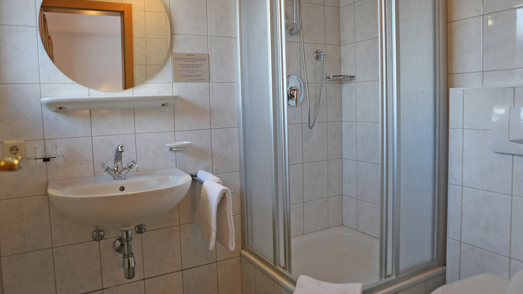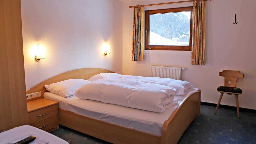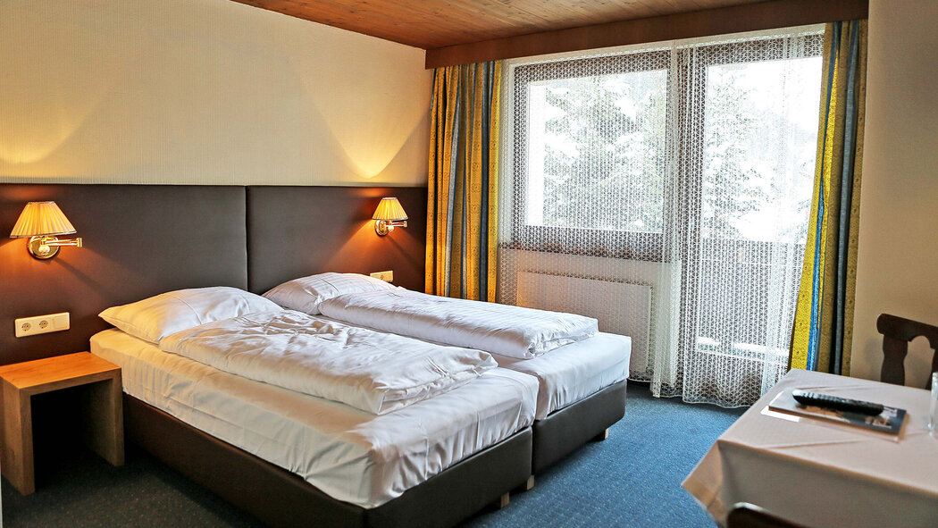 Economy Doppelzimmer (ca. 17 - 19 m2) mit einem Twin-Bett, Dusche und WC, Haarfön, Handtücher, W-Lan, 32 Zoll HD-Flat Screen mit über 130 Programmen, Sitzmöglichkeit, teilweise Balkon und Ausblick auf die traumhafte Bergwelt.